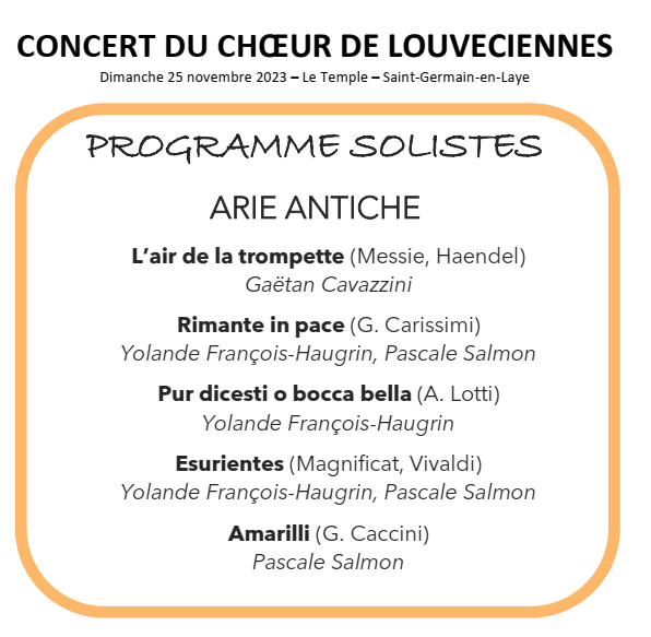 Samedi 25 novembre 2023, le Choeur de Louveciennes, dirigé par Gaëtan Cavazzini a donné un concert à 20h30, avec la participation de Jeyran Ghiaee au piano et celle de deux solistes soprani, Yolande François-Haugrin et Pascale Salmon.